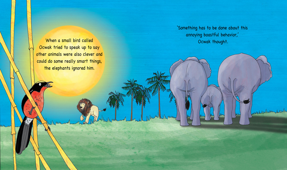'A very long time ago, ELEPHANTS always BOASTED to the other animals about being the BEST at everything. A small BIRD called OCWAK knew this was not TRUE and decided to do something about the Elephant’s BOASTFUL BEVAHIOUR.'